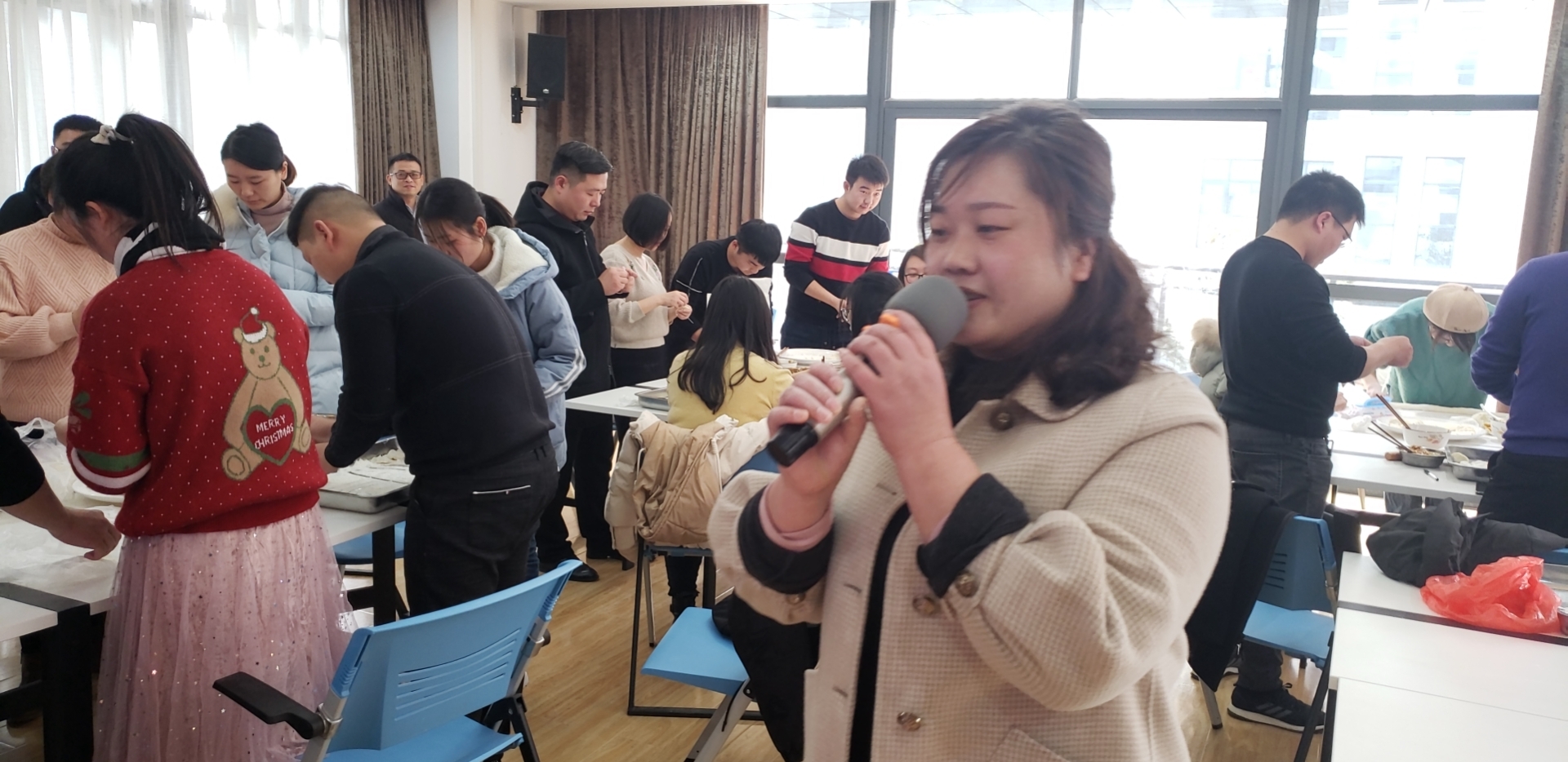 正能量小王子王恒飞平时总是嘻嘻哈哈,活动中主动主持人与他聊起小时候冬至时一起和家人一起包饺子的情景。时间是藏在黑暗中温柔的手,总是在我们一恍惚一走神之间,物走星移。一转眼我们已是大人,也要承担起成人应有的责任。多年没有在冬至回家了,今年的冬至却让王恒飞格外温暖。公司的聚餐不止是吃一顿饺子,更是我们相互代替家人给予家的味道。