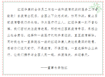 红运华康在这次疫情里面每天都在书写着故事,谱写着奉献。他们或奔赴一线,或坚持基层,或服务合作客户,或支撑基础运营。他们的故事也是红运华康人义不容辞,共克时坚,全力以赴的真实写照。我们相信,没有一次灾难没有尽头,没有一个冬天不会过去。红运华康会在党和国家的领导下,科学抗疫。红运华康也会在企业责任下,脚步不停。